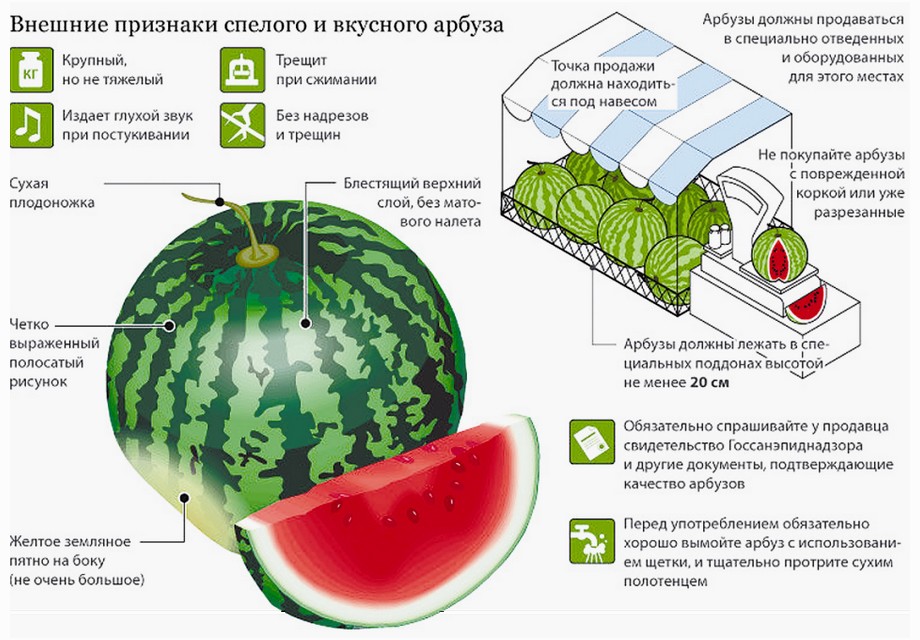 Предупреждение! Если вы хотите выбрать спелый и сладкий арбуз правильно, чтобы не отравиться, заранее избегайте придорожных точек с ягодой. Во-первых, хороший продавец там не станет, а вот нелегал с товаром без санитарной экспертизы — запросто. Во-вторых, есть шанс, что «вкусный спелый и сладкий» арбуз, как рекомендуют его вам ушлые торговцы, уже пропитался тяжелыми металлами из автомобильных выхлопов.