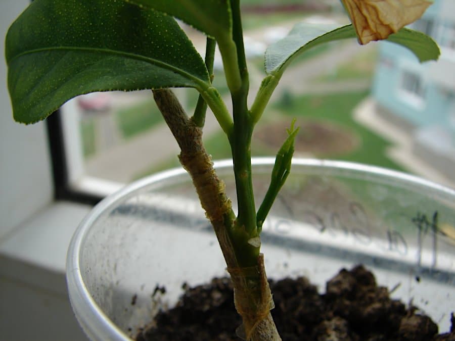 Подвоем обычно служит маленькое деревце, выращенное с косточки лимона, грейпфрута или апельсина. Толщина ствола должна быть примерно 5-6 см. Но следует помнить, что такое растение со временем будет сильно разрастаться, поэтому лучше использовать косточки карликовых деревьев.