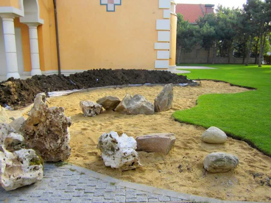 - Далее происходит укладка камней в зависимости от стиля композиции. Сначала выкладываются крупные валуны, после чего камни мельчают. Между камнями нужно оставлять промежутки, чтобы высаживать растения.