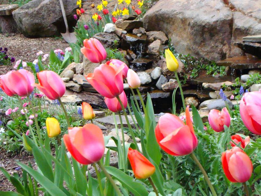 Хорошо выглядят в сочетании с камнями луковичные цветы. Их высаживают небольшими группами. Крокусы, тюльпаны, гиацинты зацветают ранней весной. Их цветение делает горку живописной сразу после схода снега. Зачастую альпинарии оформляют брусникой или черникой. В дополнение к ним высаживают лилейник, бадан или камыш. Фон заполняют травянистыми растениями.
