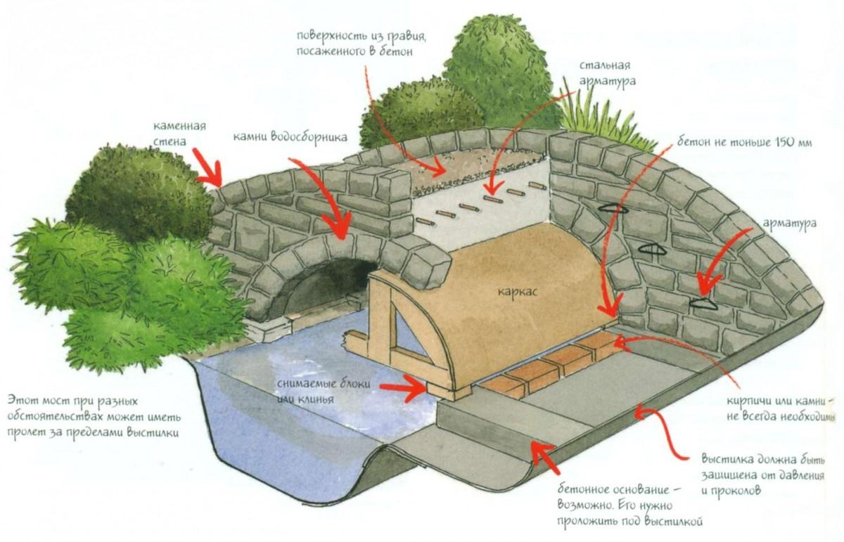 При строительстве мостика на даче из натурального камня также важно учитывать общий вес конструкции. В некоторых случаях для осуществления строительных работ с использованием такого строительного материала приходится использовать специальную технику