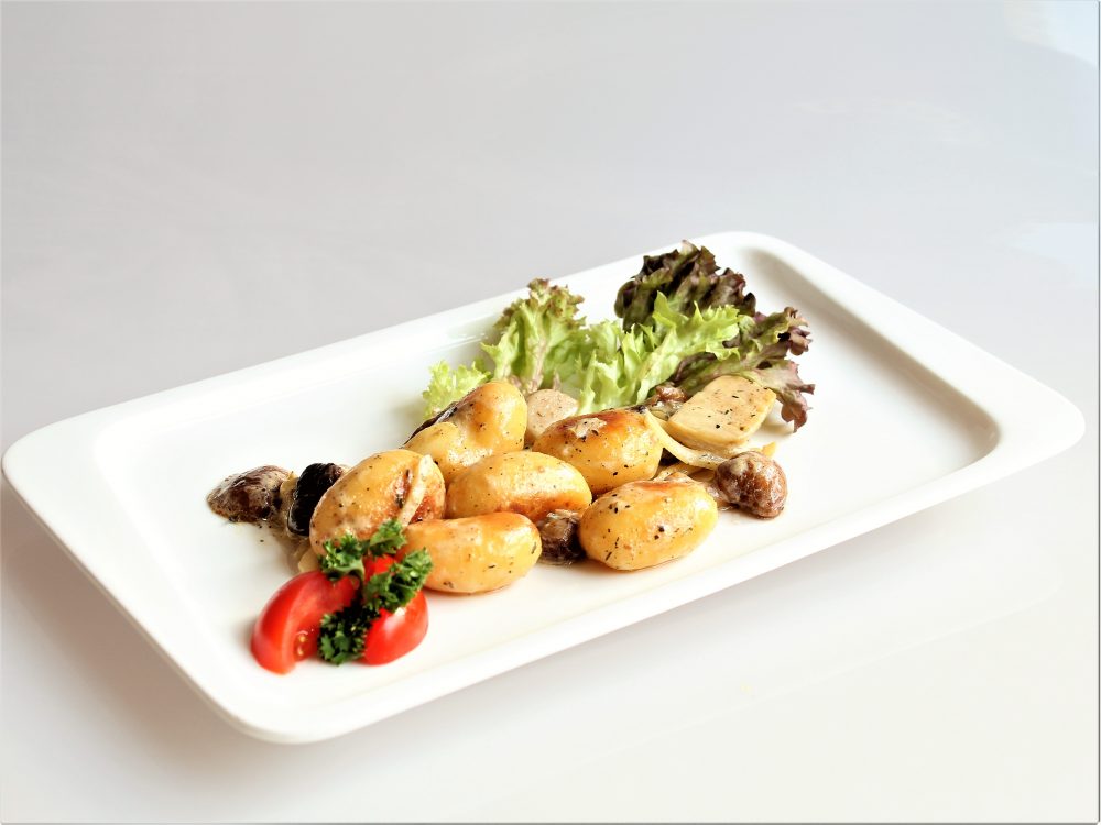 - Отварить картофель в кожуре, затем остудить, очистить и разрезать пополам. Затем выложить в глубокую емкость и залить сметано-грибной массой.