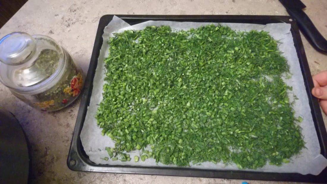Измельченный укроп также сушат в тени, располагая его небольшим слоем на поддонах или плоских тарелках. Траву сверху можно прикрыть марлей, чтобы избежать оседания на заготовку пыли.
