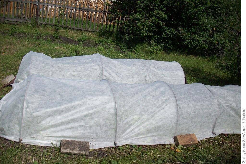 Не меньшую популярность, чем полиэтилен, сейчас имеет и нетканый спанбонд. Он позволяет формировать укрытие даже без каркасов. Этот материал не причиняет вреда посадкам, отличается мягкостью. Даже при плотном контакте не деформирует растения. Нетканое покрытие пропустит и свет, и воздух, и осадки, а само не разрушится под действием ультрафиолета.