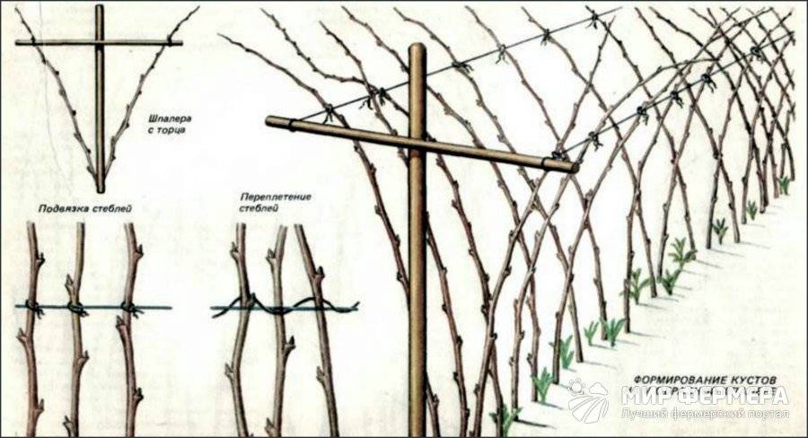 Ветки привязывают к проволоке первого уровня. На следующий год длина поросли увеличивается, и молодые побеги подвязывают ко второй проволоке. Еще через год процедуру повторяют, подвязывая побеги к третьей проволоке. В дальнейшем всю поросль, образовавшуюся возле корневой шейки, удаляют, а молодые побеги укорачивают или срезают, чтобы куст оставался компактным.