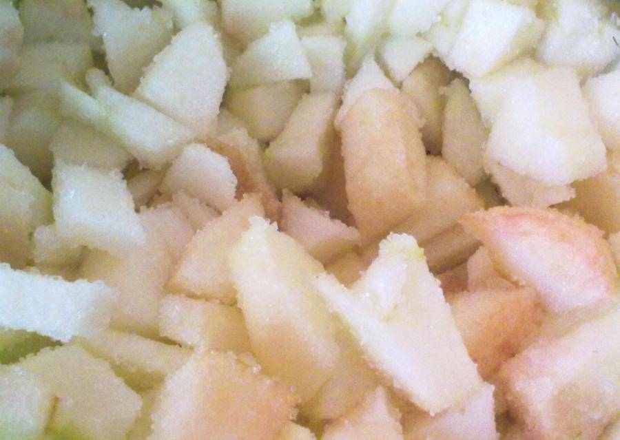 - Подсушить ломтики и пересыпать в кастрюлю. Добавить в емкость указанное в рецепте количество сахара. Аккуратно размешать плодовые кусочки.