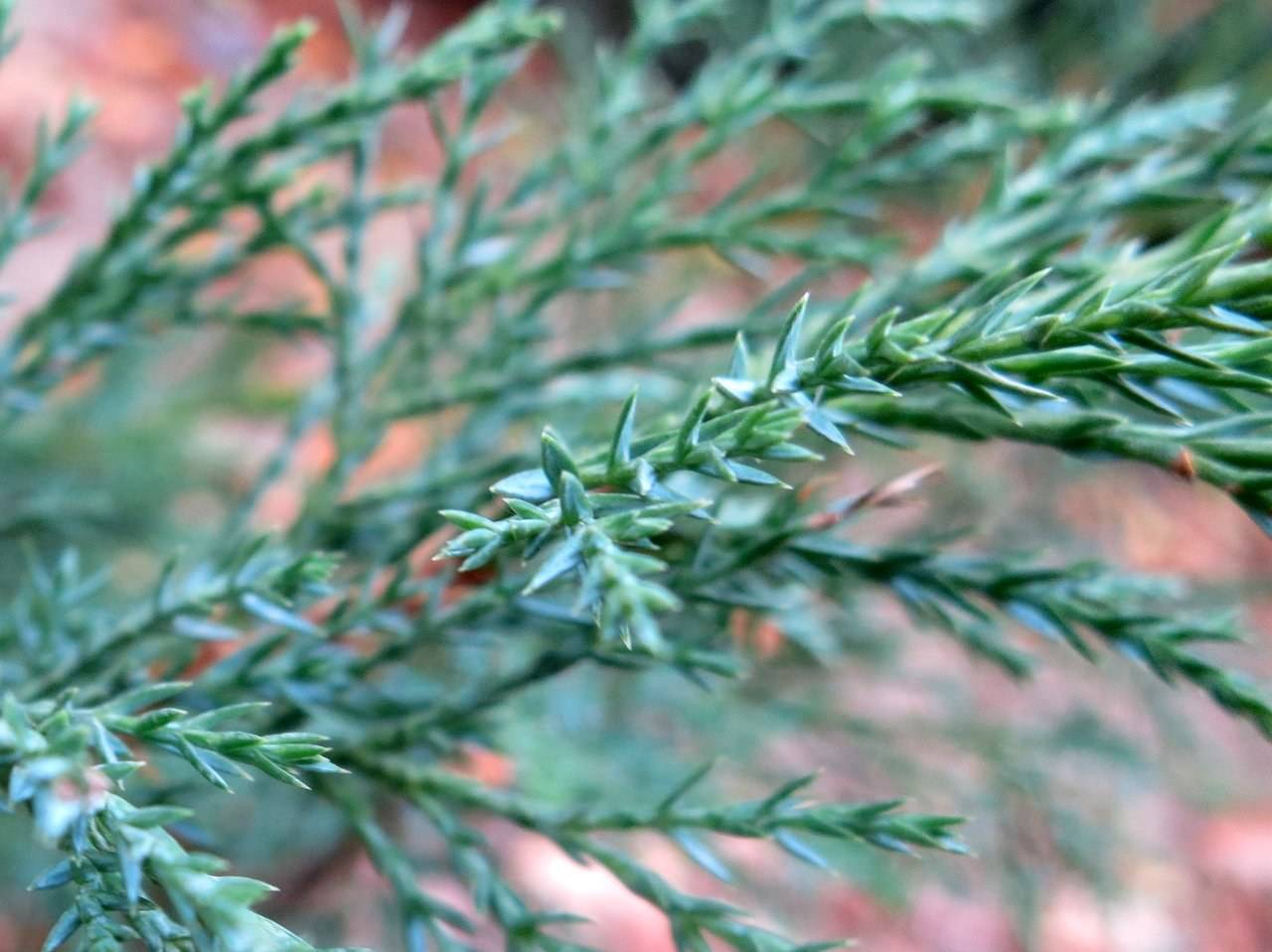 Хвоя можжевельника Пфитцериана зеленая, с серым (серебристым) налетом.