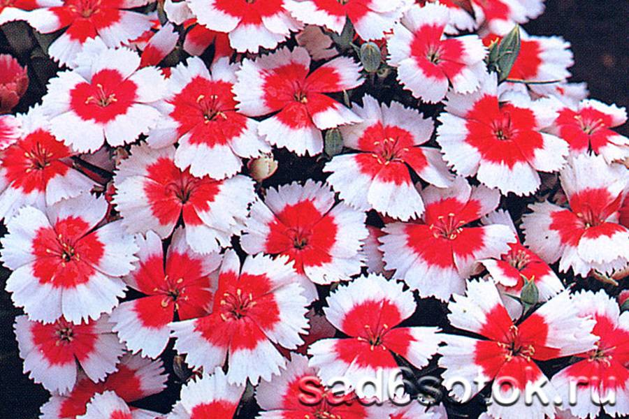 Радостные цветы этой карликовой разновидности китайской гвоздики украсят клумбу, великолепно смотрятся в подвесном кашпо или вазоне на крыльце. Кустики аккуратные, высотой до 20 см с узловатыми стеблями и многочисленными цветками диаметром 5–6 см белого цвета с алой серединкой.
