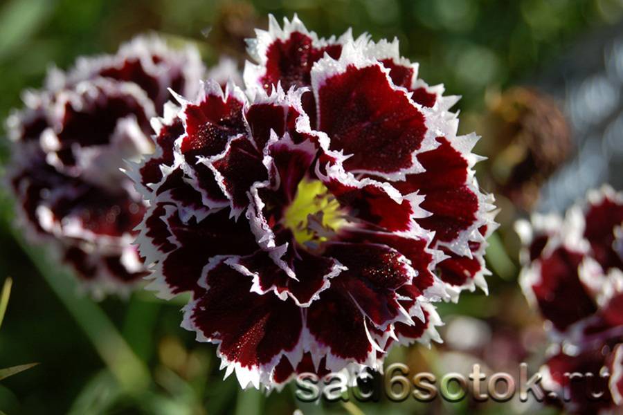 Замечательная вариация гвоздики Геддевига с густоветвистыми стеблями светло-зеленого цвета, образующими небольшие кусты высотой около 35 см. Растения сплошь покрыты махровыми цветками диаметром 4–5 см. Лепестки атласные, малиново-черные с зубчатым краем и яркой белой каймой.