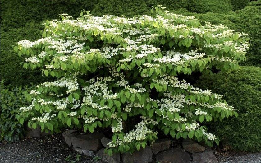 Этот декоративный вид известен также под названием «японская калина», поскольку родом из Азии. Компактный кустарник пирамидальной формы способен достигать в высоту 3 м (в зависимости от особенностей сорта). Ветви, расположенные параллельно земле, с начала весны густо украшены белоснежными или нежно-розовыми крупными соцветиями.
