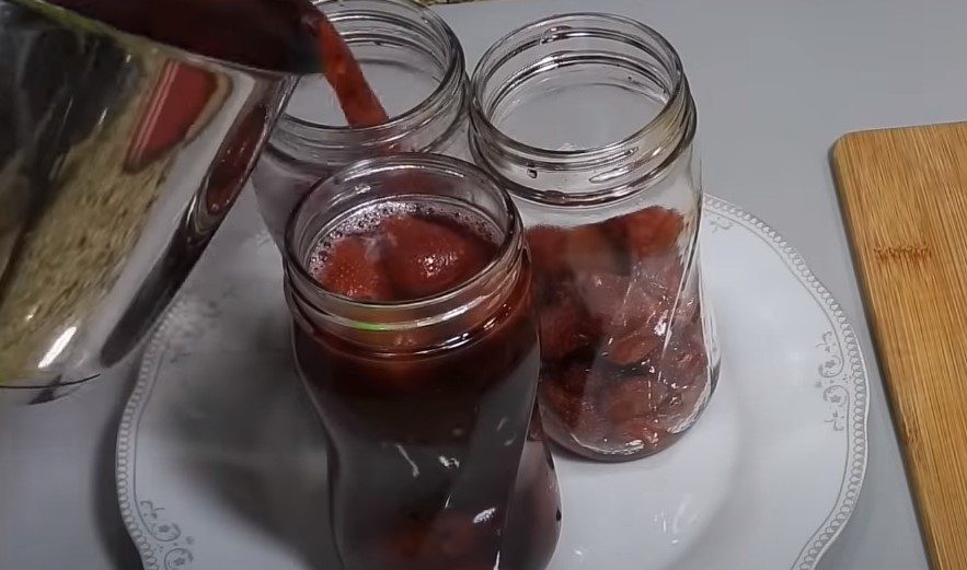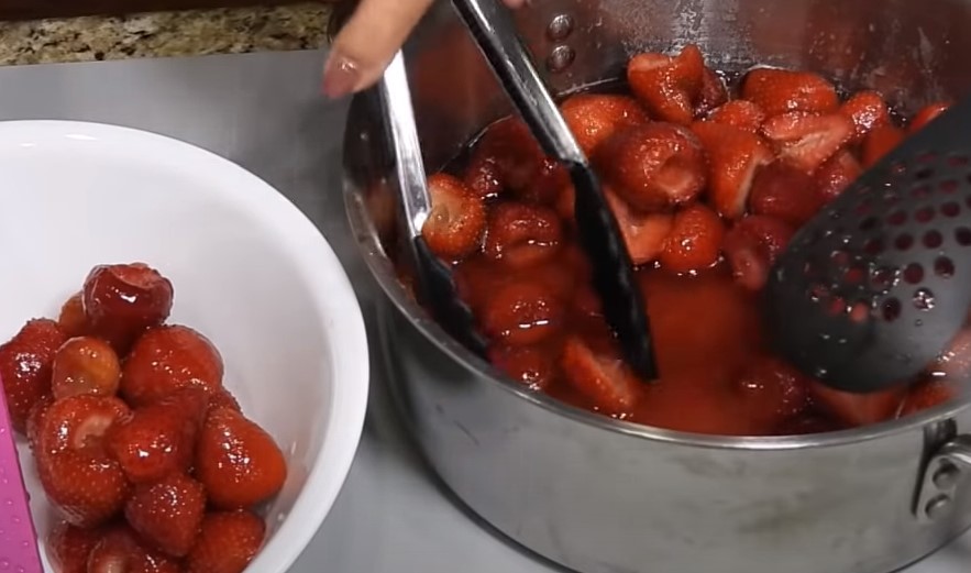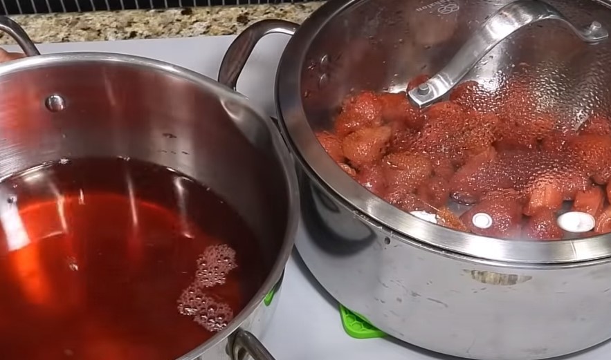 3. После возьмите дуршлачок и через него не спеша, слейте весь красный сироп. Именно его вновь закипятите (10 минут), а после вновь залейте им викторию. Такую процедуру повторяйте 3-4 раза.