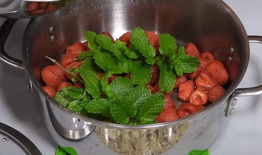 9. Вечером вновь ставим на плиту, но уже добавим в него небольшую веточку мяты. Также доводим до кипения, снимая пену. И затем снова оставляем на 10 часов, уже до утра. Ничего страшного, если ягоды будут настаиваться не 10, а 12 часов — хуже не будет. А Вы сможете отлично выспаться, а утром еще и позавтракать.
