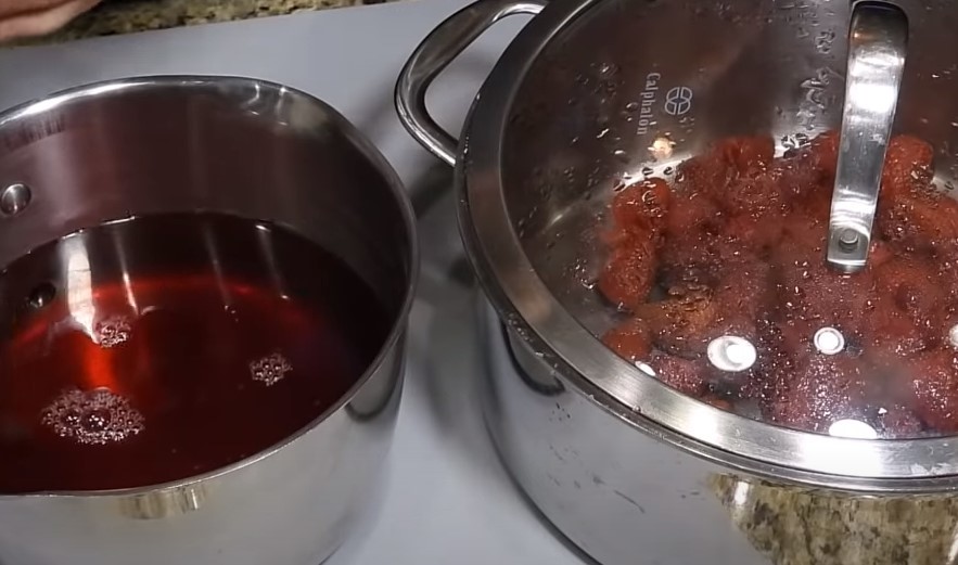 Дайте массе остыть, не перемешивайте. За счет того, что карамель горячая она поспособствует большей отдаче сока, выдержите до полного остывания.