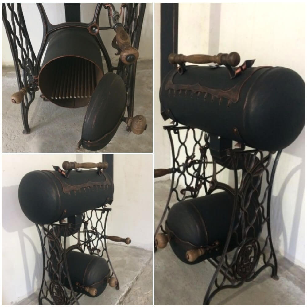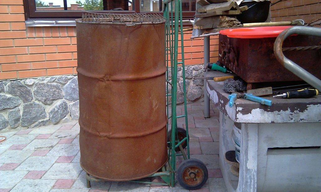 Но на этом инженерная мысль не остановилась. Громоздкую конструкцию решили сделать более компактной, поставив вертикально. Теперь даже ножки не нужны. Правда, при этом затруднительно готовить шашлык, зато копчение пойдет полным ходом.
