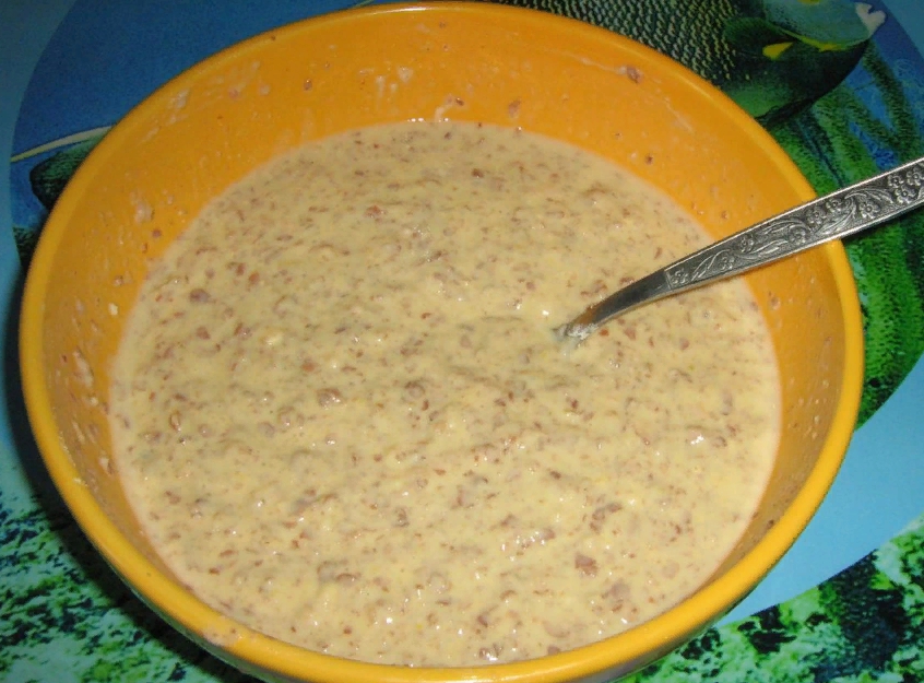 Мясо вместе с луковицей пробиваем в блендере до однородного состояния. Далее добавляем яйца и тщательно перемешиваем массу. После – добавляем хлопья (для данного рецепта лучше всего использовать хлопья быстрого приготовления или же измельчить обычные). После – добавляем специи по вкусу и, при желании, нарубленную зелень.