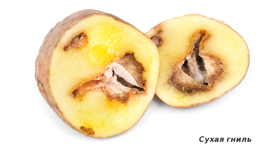 Сухая гниль вызывает появление темных пятен на кожуре, пораженные участки сморщиваются и проваливаются из-за повреждения тканей, лежащих ниже. На кожуре может быть заметен белый плесенеобразный налет, при разрезании клубня обнаруживаются полости, заполненные налетом белого, зеленоватого, желтоватого оттенка из-за активного размножения болезнетворного гриба. Ткани этих участков твердые, крошащиеся. К весне клубни становятся легкими, пустотелыми. Нередко к заболеванию присоединяется мокрая гниль.