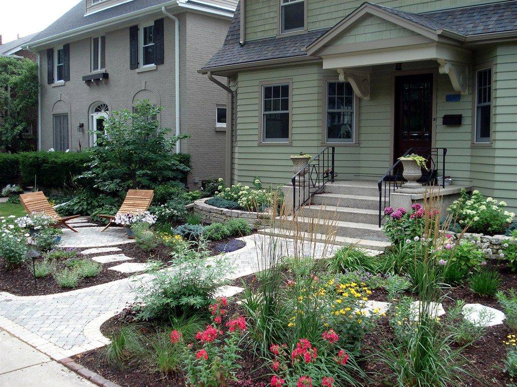 В палисадник высаживаются яркие и красивые цветы. Лужайку нужно засеять травой, но она не должна иметь вид аккуратного газона. Лучше выбрать такую, которую не требуется подстригать и обязательно разбавить вкраплениями полевых цветов.