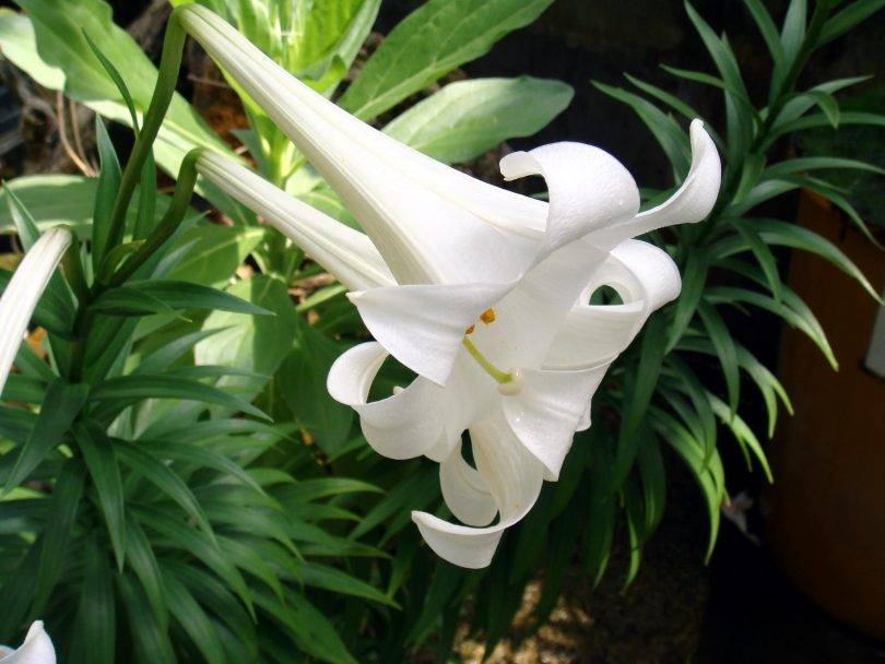 Одним из самых популярных сортов домашних лилий в горшке является аполло. Это белая лилия, диаметр цветков которой достигает 12 см. Они растут пышными кистями, напоминая ослепительно белые колокольчики. Они символизируют чистоту. Этот сорт цветов обладает также целебными качествами. Настойки из белой лилии применяются в качестве обезболивающего, ранозаживляющего средства, а также при лечении гематом.