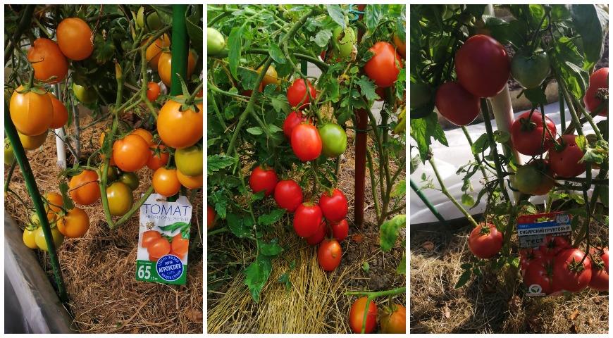 На фото томаты для открытого грунта и теплицы: Авюри Оранжевый; Венгерские кечкемети; Сибирский грунтовой