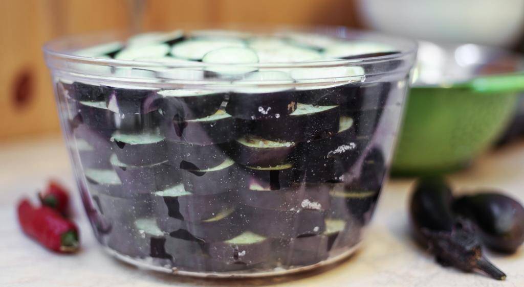 - Тщательно вымойте баклажаны, оботрите бумажными полотенцами и сделайте на каждом плоде неглубокие продольные зарубы. После этого поместите их в подсоленную воду хотя бы на полчаса-час – за это время из мякоти выйдет вся горечь, и она станет более приятной на вкус.