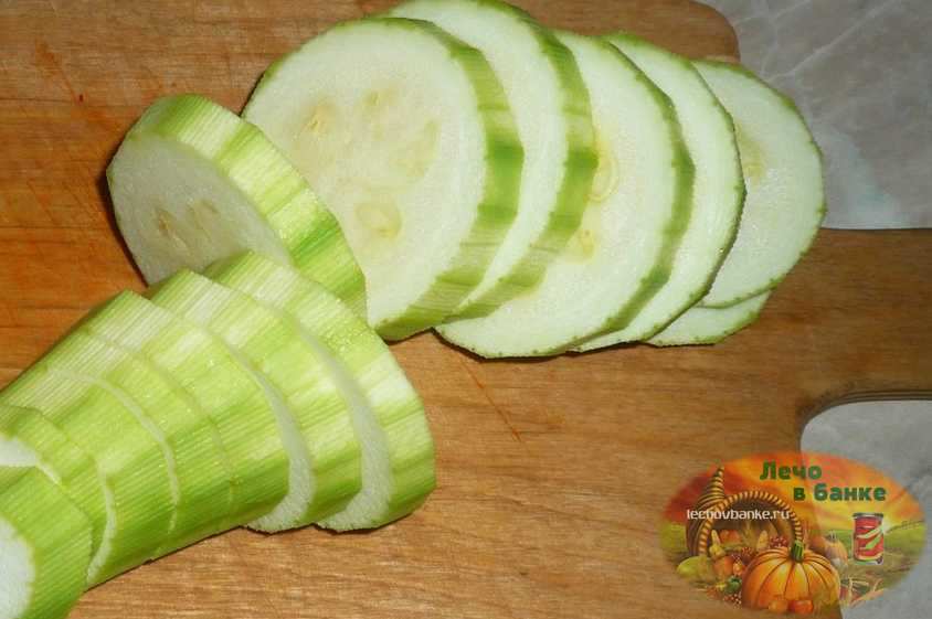 5.Кабачки помойте, обрежьте кончики и нарежьте кружочками по 1,5-2 см, не очень тонко. У молодых экземпляров не нужно срезать кожицу.