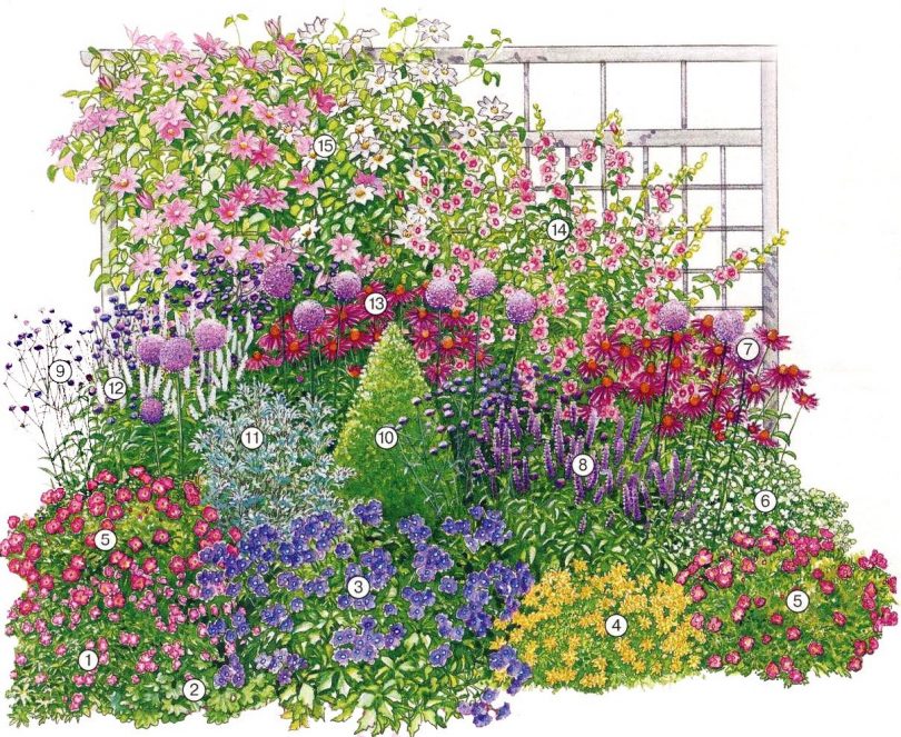 Поэтому первостепенно важно проектировать миксбордер своими руками по схеме, фото, подбору растений. В проектировании надо описать цвета культур, время их цвета: