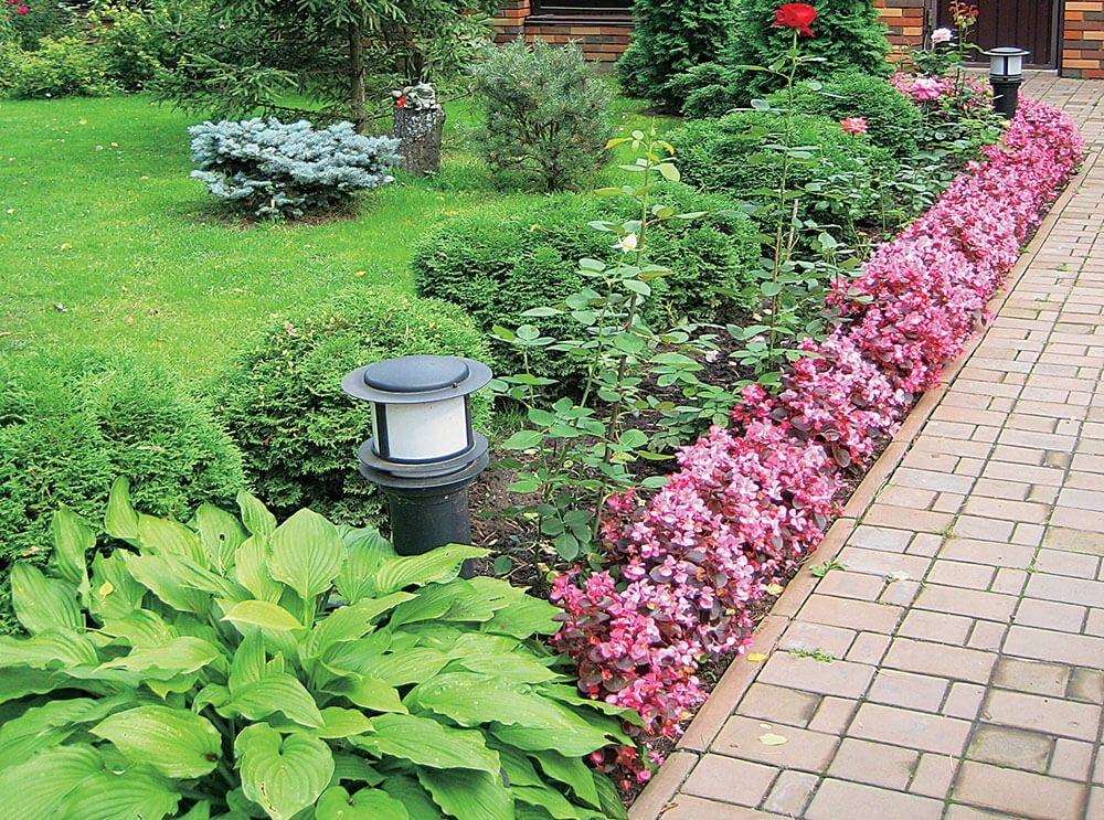 Для оформления дорожек и рабаток можно использовать композиции с двумя-тремя сортами одного и того же растения. Картина при этом, естественно, должна быть целостной и гармоничной – не забываем про правила ярусности и сочетаемости оттенков.