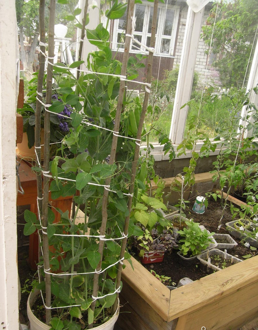 Некоторые любители выращивают горох даже в условиях городской квартиры. Правда, сделать это сложнее, чем на огороде. Если нет хорошо освещённого подоконника, потребуется дополнительная подсветка. Чтобы на какое-то время сэкономить место в квартире, сначала выращивают рассаду: сеют горошины в маленькие стаканчики, а потом уже пересаживают их в большие ящики. Используют почву с грядок, где летом росли паслёновые или тыквенные. С наступлением тёплых дней горох в ящике выносят на балкон, а при достижении растениями высоты 10–15 см подвязывают их к опорам. С началом цветения регулярно поливают и подкармливают фосфорными и калийными удобрениями. Плодоносит горох на балконе около 2 месяцев.