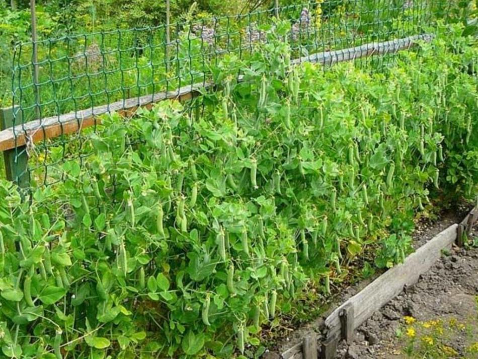 Кусты гороха нуждаются в опоре из проволоки или сетки натянутой и закрепленной на колышках забитых в землю рядом с растениями.