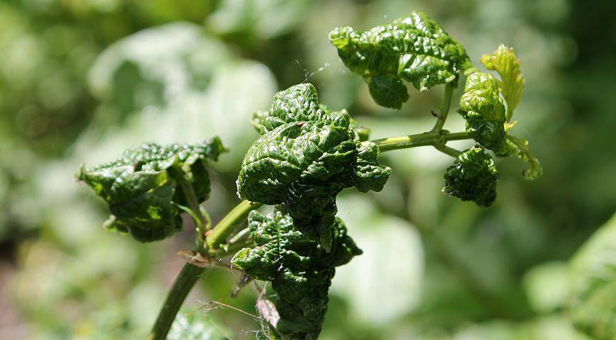 - Верхушки молодых побегов «курчавятся», темнеют и сохнут.