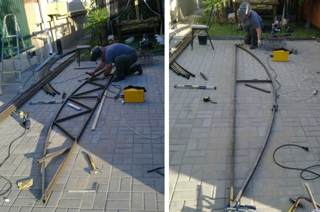 После началось изготовление ферм. Сначала на трубогибе выгнули профили с требуемым радиусом (подъем в высшейточке 1,2 м). После началась сборка «конструктора».