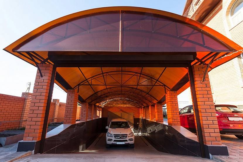Форма навеса может быть арочной (хорошие характеристики, элементы должны быть идентичны друг другу), двухскатной (имеет все характеристики кровли для дома) и односкатные (самый простой и надежный вариант).
