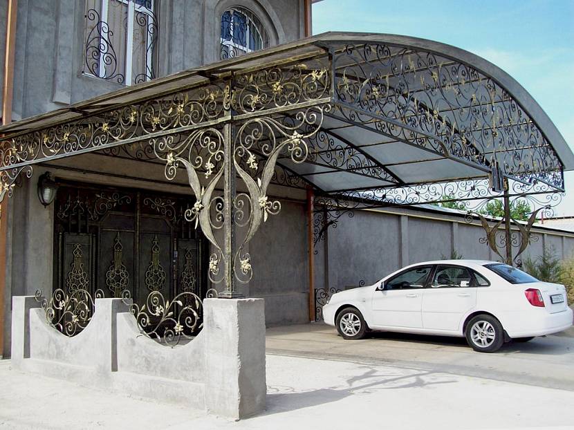 Одно- и двухскатные крыши оптимальны для всех видов навесов из дерева, кирпича, бетона, камня, для кованых изделий. Для сварных металлический конструкций, все больше, устраивают арочную кровлю. Чтобы грамотно рассчитать навес из металлопрофиля своими руками, чертежи должны отражать, помимо размеров постройки, радиус дуги крыши.