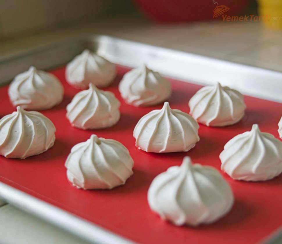 Выкладываем безе на противень, покрытый пекарской бумагой. Для этого берем массу ложкой и капаем на противень. Можно выдавить безе при помощи различных насадок. Или просто через целлофановый пакет.