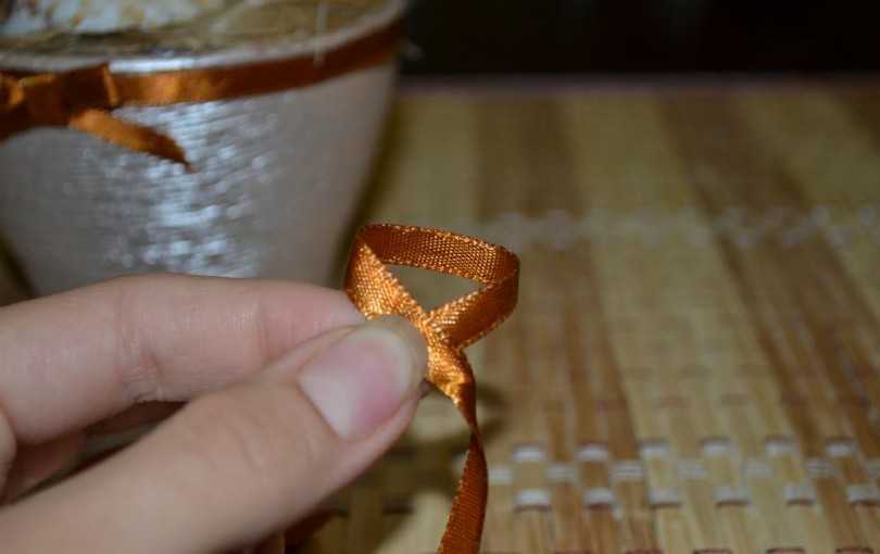 Украсьте ствол деревца уже на этой стадии. Используйте ленты, веревочную тесьму, краски и блестки. Если вы приступите к декору уже после закрепления топиария, будет сложно выполнить декорирование аккуратно.