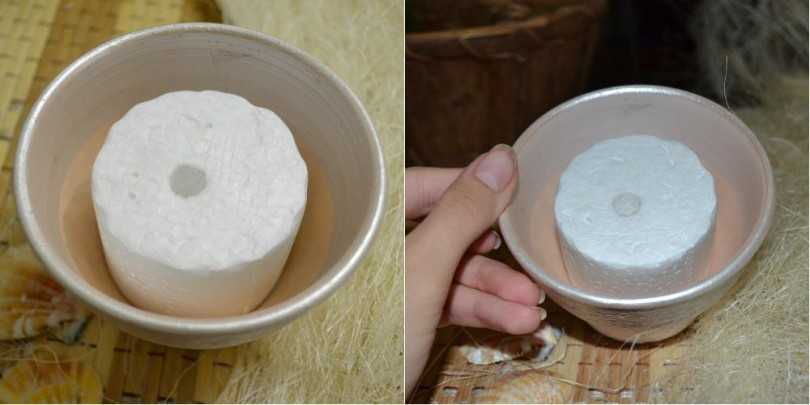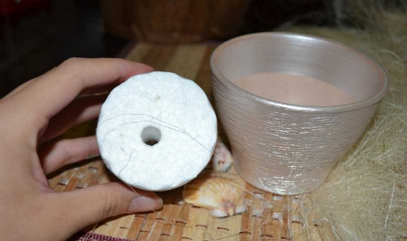 - Внутрь горшочка нужно положить или пенопласт, или флористический оазис. Подойдет также любой вид материала, способный удерживать в себе будущее деревце, при этом надежно фиксируя его.