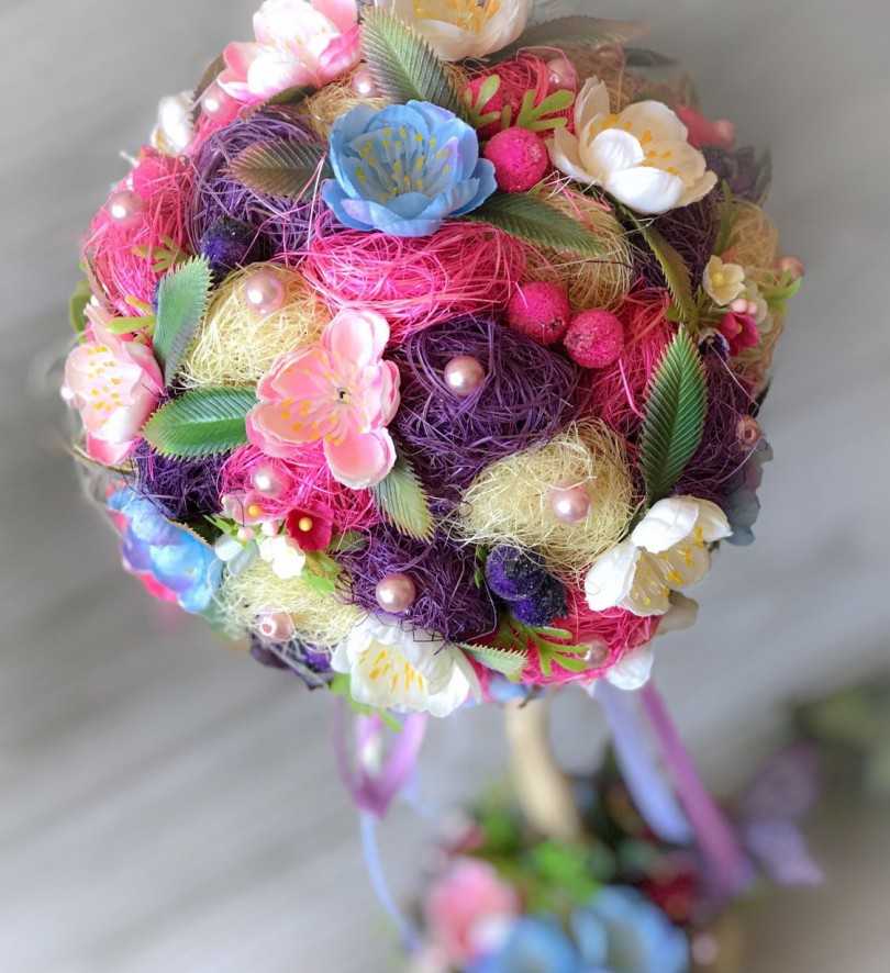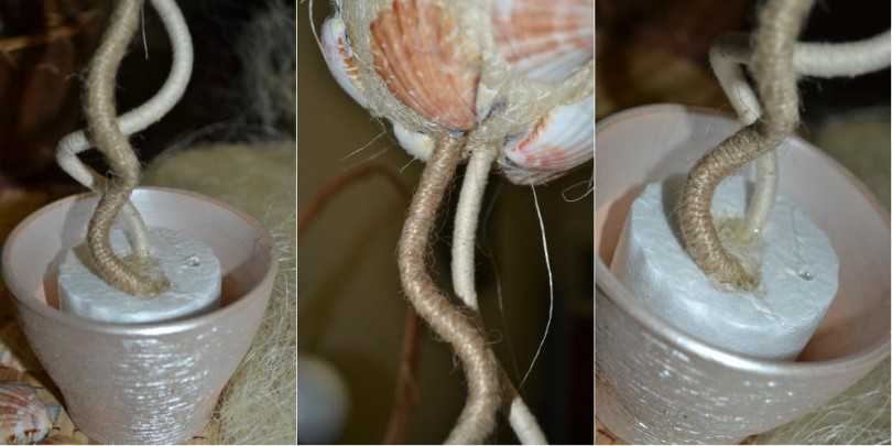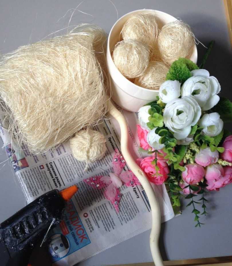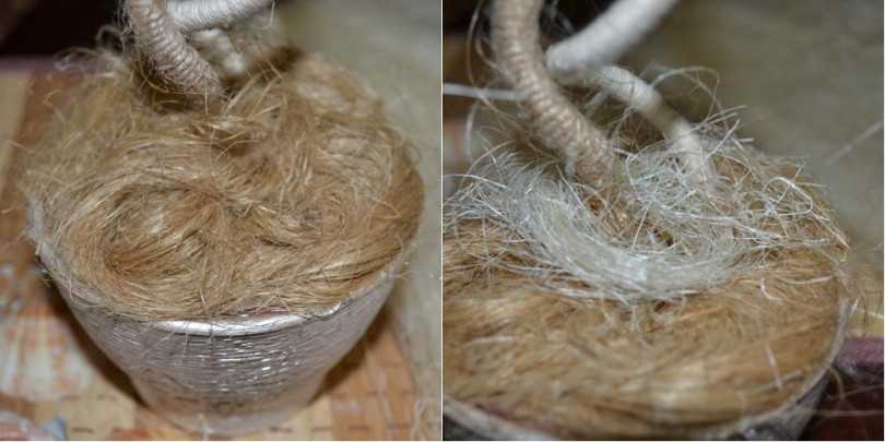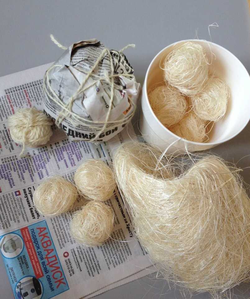 Если не удалось приобрести натуральный сизаль, то для декора можно использовать другие флористические волокна. Например, натуральный ворс из щетки для побелки. Поделки из сизаля предполагают разные цветовые решения.