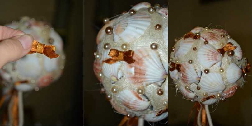 - Между шарами могут оставаться пустые промежутки. Их заполнить с помощью шариков поменьше, любых других игрушек, мишуры. Подойдет любой декор, который будет сочетаться по дизайну и впишется в общий внешний вид топиария.