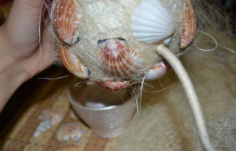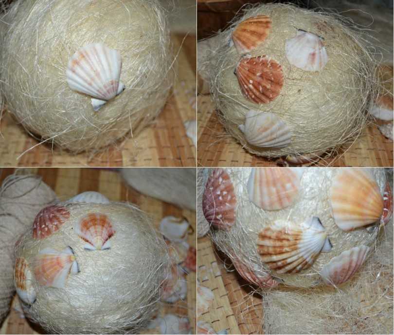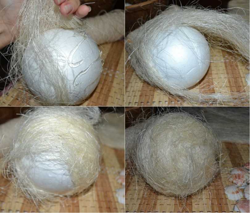 - Сизаль – натуральное волокно и нуждается в дополнительной обработке. Поэтому, сформированный шарик нужно промазать клеем ПВА и дать ему хорошенько высохнуть. Затем повторите процедуру повторно. После этого шарик будет твердым и не распадется. А лишние ворсинки можно обрезать ножницами.