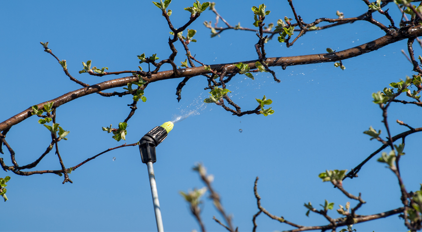 Лучше всего, когда деревья еще спят или уже отправились в спячку. То есть ранней весной и поздней осенью. Но и в сезон проводить обработку можно. Главное, не опрыскивайте смесью плоды.