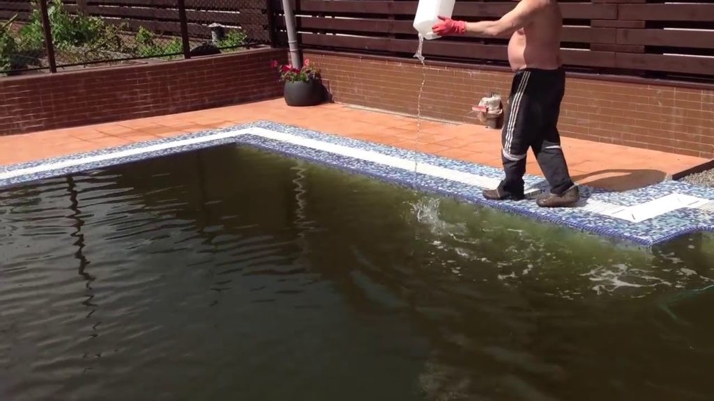 Еще одним вариантом считают заливку в бассейн специальных средств, которые помогают устранить загрязнения не только в воде, но и на стенах.
