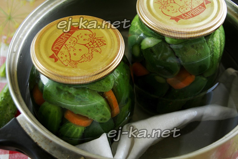 Накроем банки винтовыми или металлическими крышками и поставим стерилизоваться в кастрюлю, на дно которой положим ткань или подставку. Вода в кастрюле должна быть теплой. Стерилизовать банки с огурцами нужно очень быстро. Как только вода в кастрюле вскипит, а огурчики в банке начнут темнеть, сразу банку вынимаем.