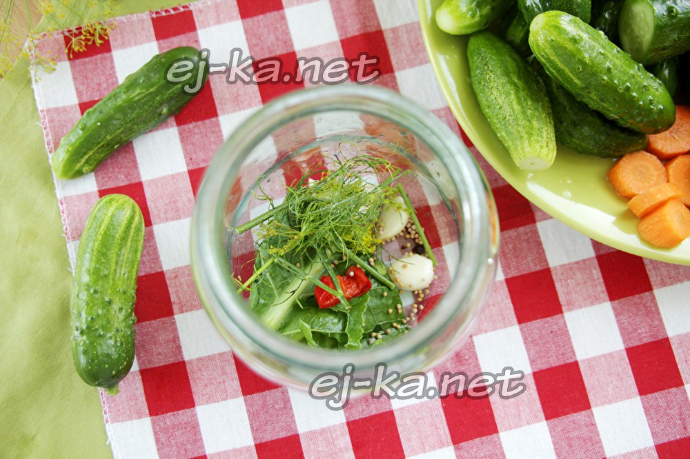 Банки простерилизуйте любым удобным для вас способом: на пару, в микроволновке, в духовке и т. д. На дно уложите по 2-3 зубчика чеснока, по 3 веточки укропа и петрушки, несколько горошин черного и душистого перца. Также разложите по баночкам по 5-7 колечек молодой морковки и по 5 колец репчатого лука. Очистите корень хрена и добавьте совсем немного — буквально 0,5 см, он придаст пикантный вкус огурчикам (если корня хрена нет, то можете не добавлять, он не является обязательным ингредиентом).