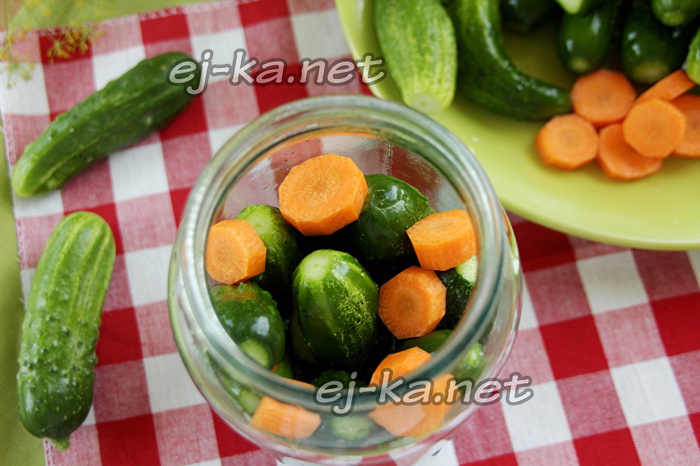 Выкладываем слой огурцов, размещая их вертикально, как можно теснее, чтобы постилось побольше. Раскладываем колечки моркови.