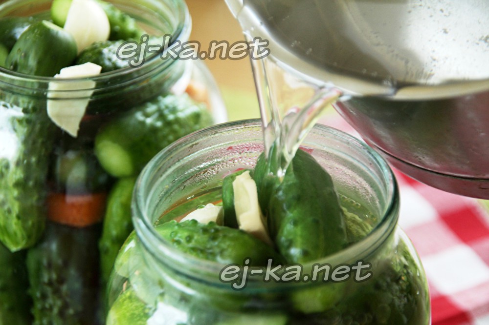 Плотно наполним банку огурцами и зальем горячим маринадом.