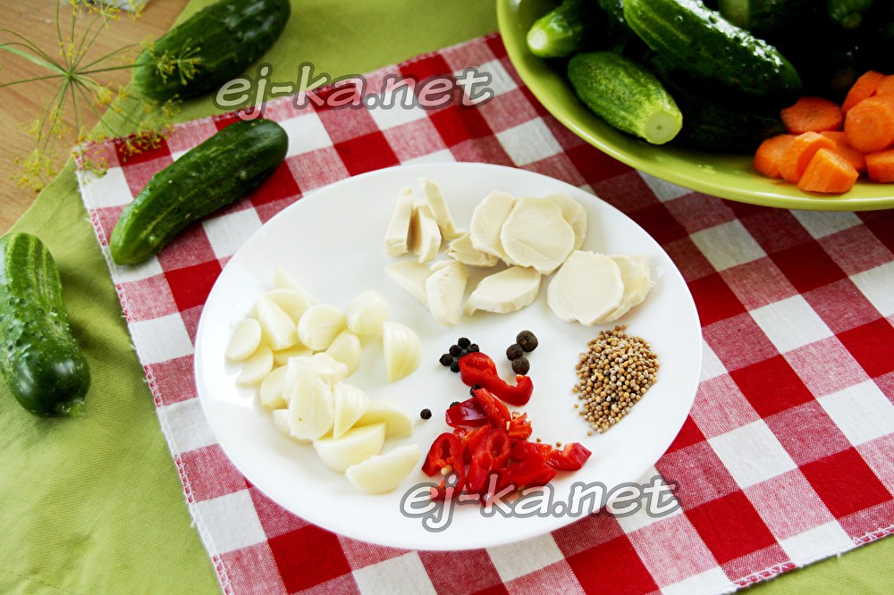 Для маринования мы постараемся выбрать огурчики помельче, чтобы закрыть их в маленькие баночки. Подготовим и другие ингредиенты, которые нам нужны.
