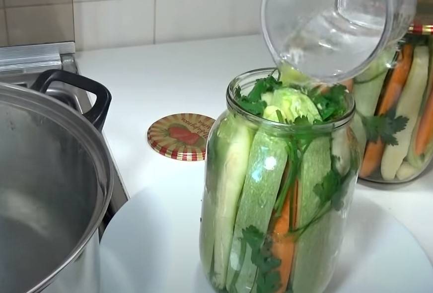 - Через несколько суток кабачки переложить в стерилизованные банки и залить новым рассолом.