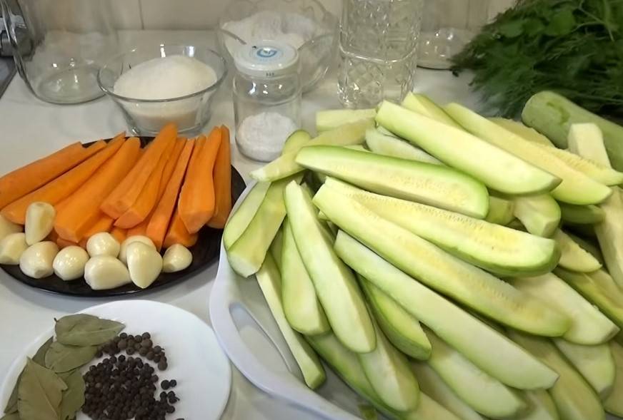 1. Прежде всего необходимо подготовить все необходимые ингредиенты. Кабачки для этого рецепта используем молоденькие, с мягкой кожурой. Лучше всего брать овощи небольшого размера, под высоту литровой банки. Кабачковые кусочки должны входить в банку стоячком.