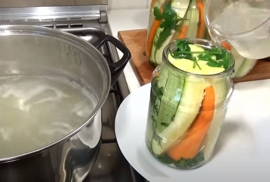 4. Ароматную овощную воду снова ставим на огонь и вновь доводим до кипения. Кипящей водой еще раз заливаем банки с кабачками. Прикрываем крышкой и оставляем теперь уже на 30-35 минут. По прошествии этого времени овощной отвар возвращаем в кастрюлю и займемся приготовлением рассола на основе этой воды.