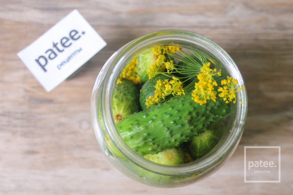 В это время банки с огурцами наполните зонтиками укропа по 4 штуки в каждую банку.